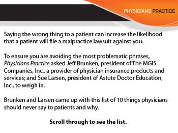 Poor physician communication makes it more likely a patient will file a malpractice lawsuit against you. Here are 10 things to never say to patients.