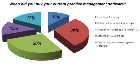 Only 14 percent said their software was more than 10 years old; an additional 17 percent said they are currently not using practice management software at all.